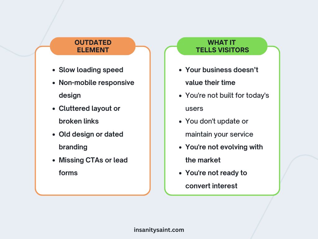 A site that loads slowly, doesn’t work on phones, or still shows a copyright from 2019 doesn’t just look old—it tells your customers that your business might be out of touch. And that impacts trust. Here are key signals your outdated website may be sending: